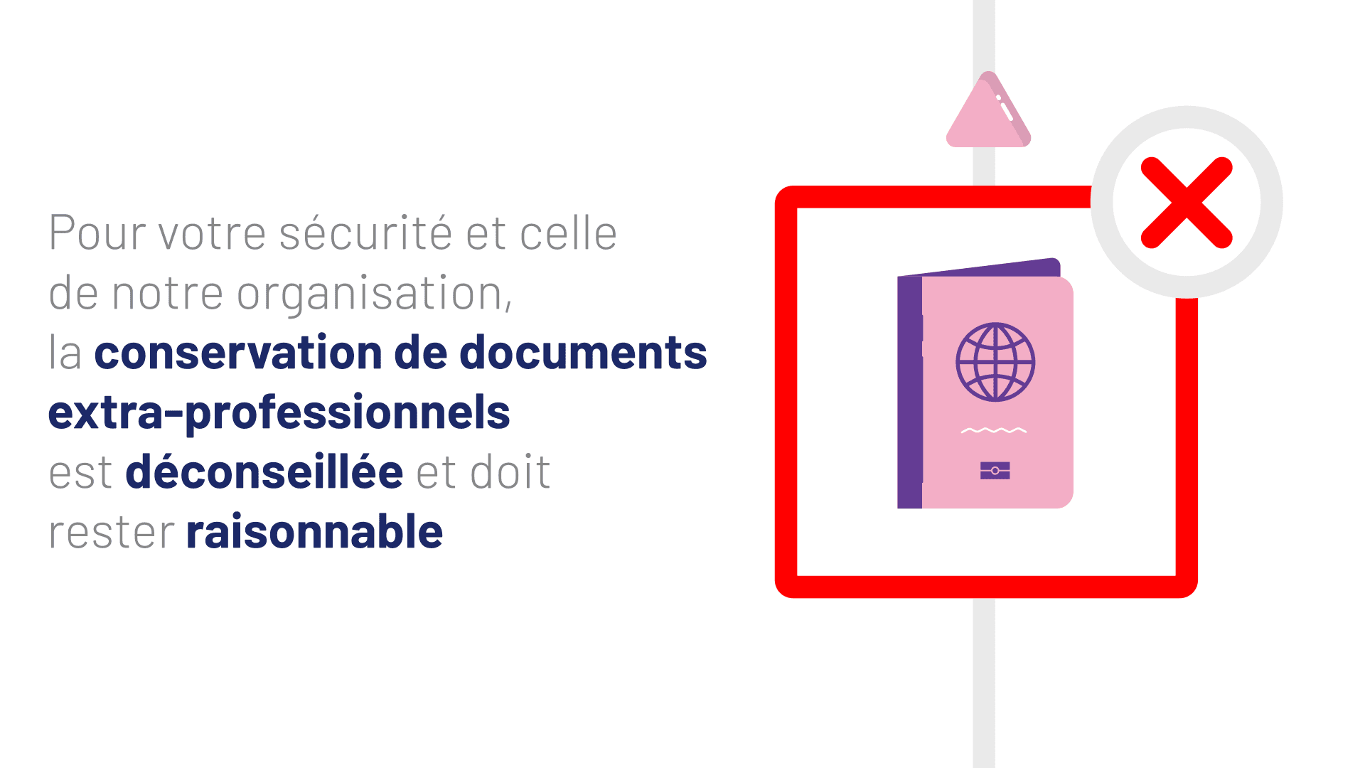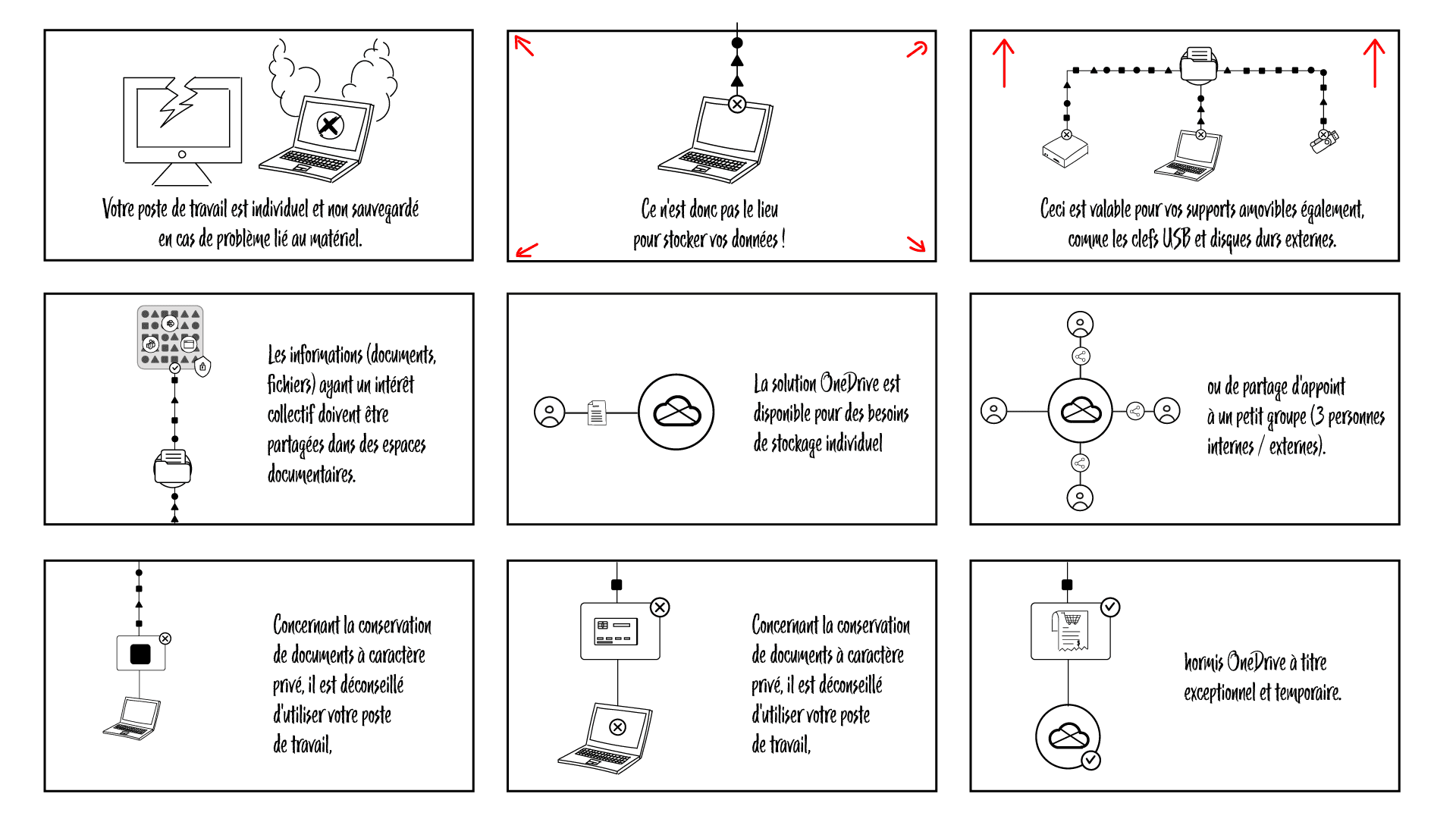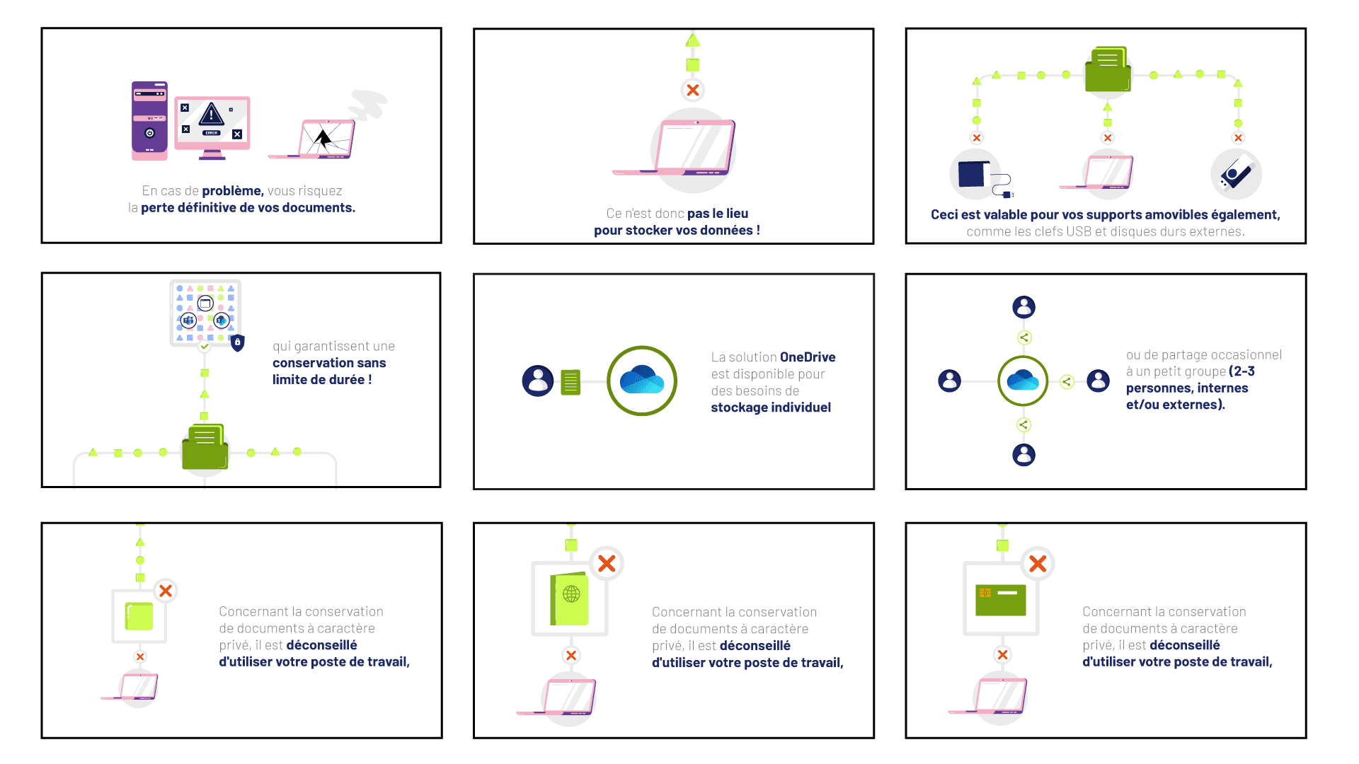 L’objectif était de rendre claires et mémorisables de nouvelles règles liées au stockage, à la sécurité et à la conservation de l’information, sur des sujets du quotidien : mails, documents, conversations et agendas.