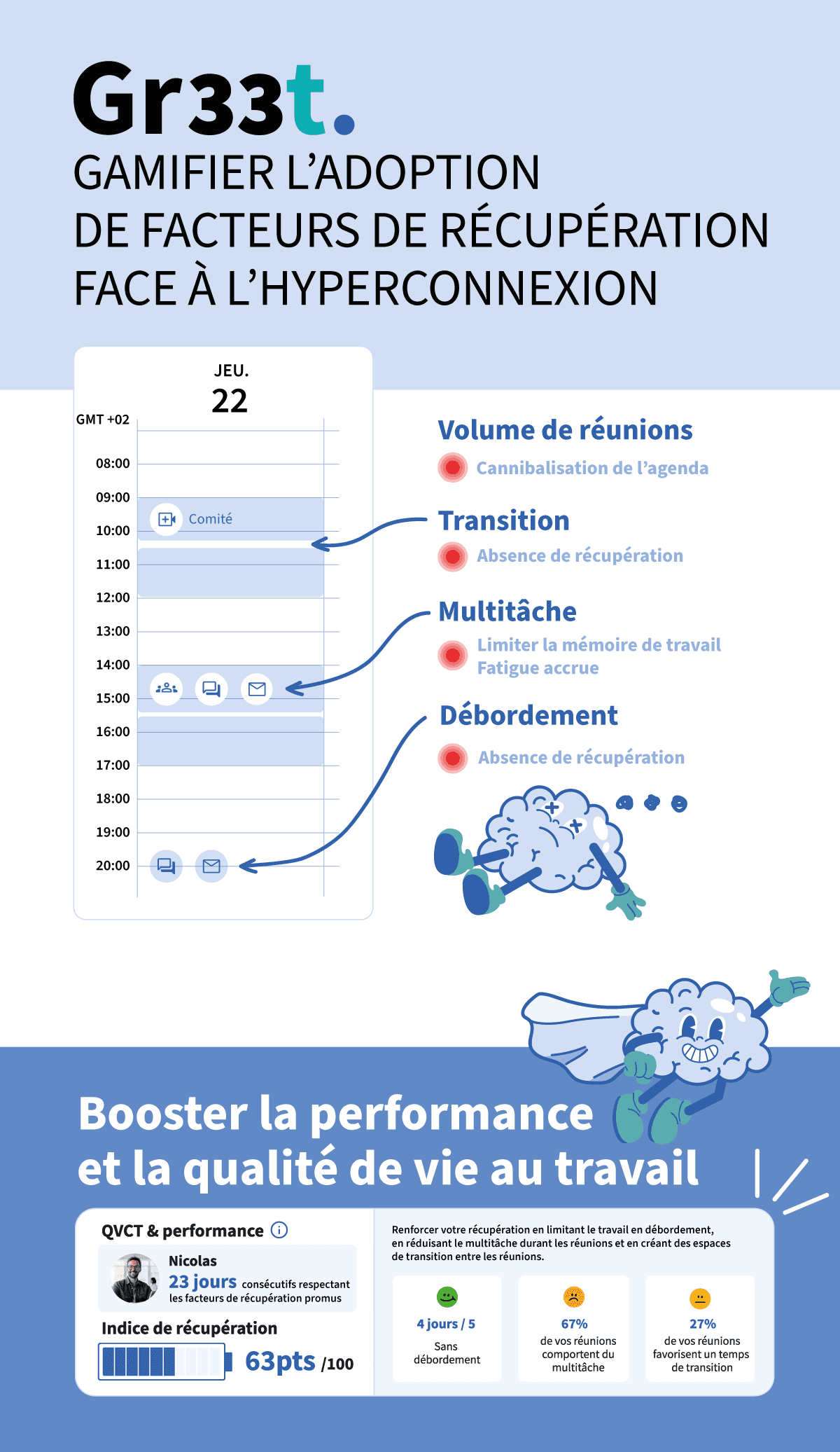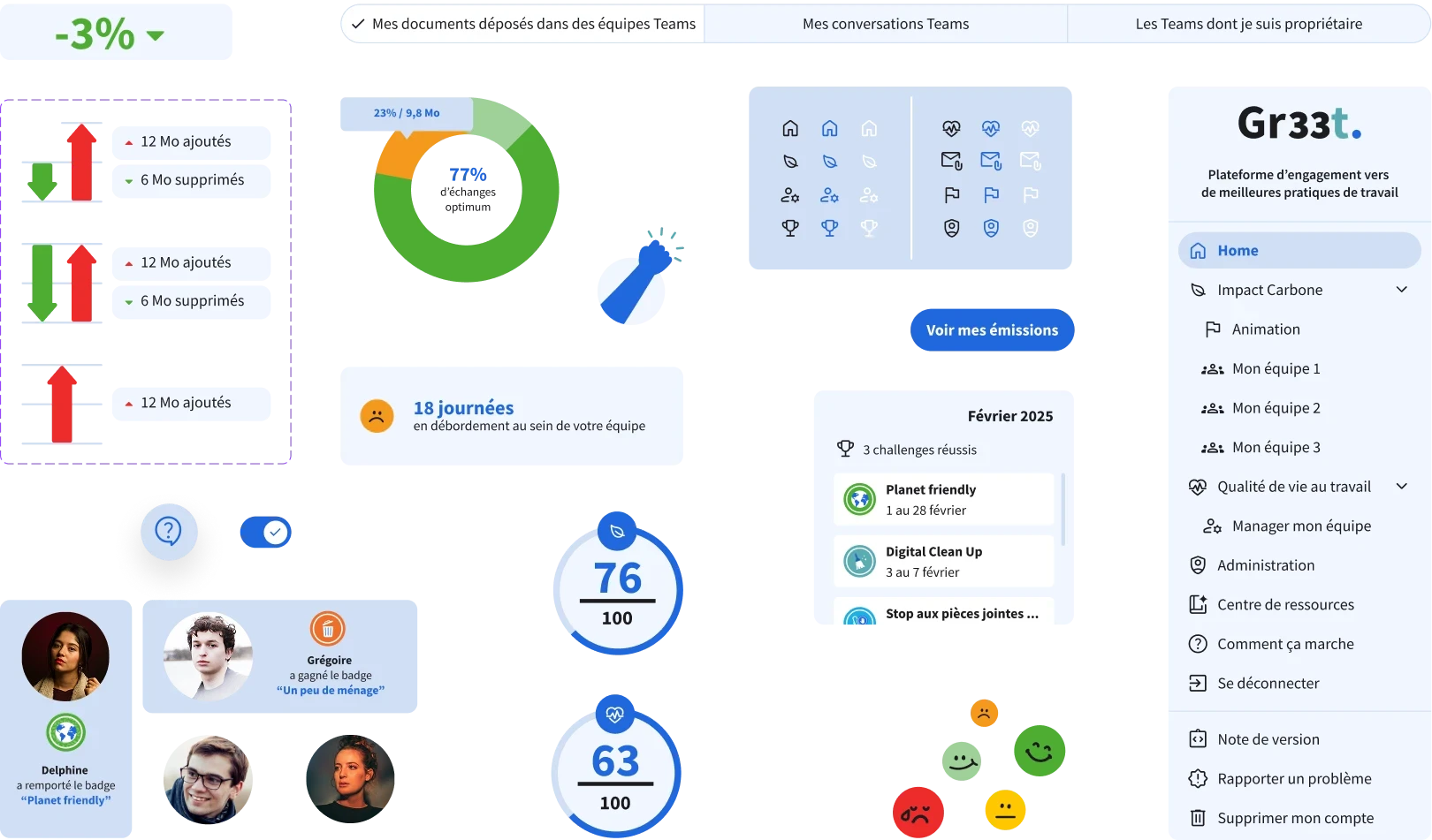 Gr33t est une application qui aide les organisations à réduire l’impact environnemental de leurs usages numériques tout en améliorant le rythme de travail et la qualité de vie de leurs collaborateurs.