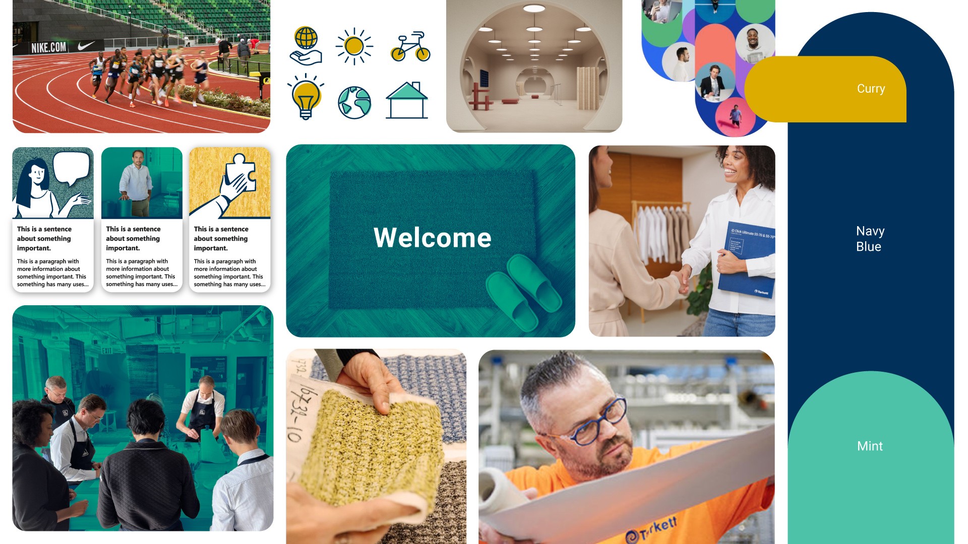 Les icônes, dessinées à la main, privilégient la lisibilité et les formes arrondies. Les illustrations sont utilisées avec parcimonie et associées à des arrière-plans texturés évoquant les sols Tarkett. Les photographies mettent en avant la diversité des métiers, des sites et des profils, avec des traitements visuels légers (coins arrondis, duotone ponctuel) afin de renforcer la cohérence d’ensemble.